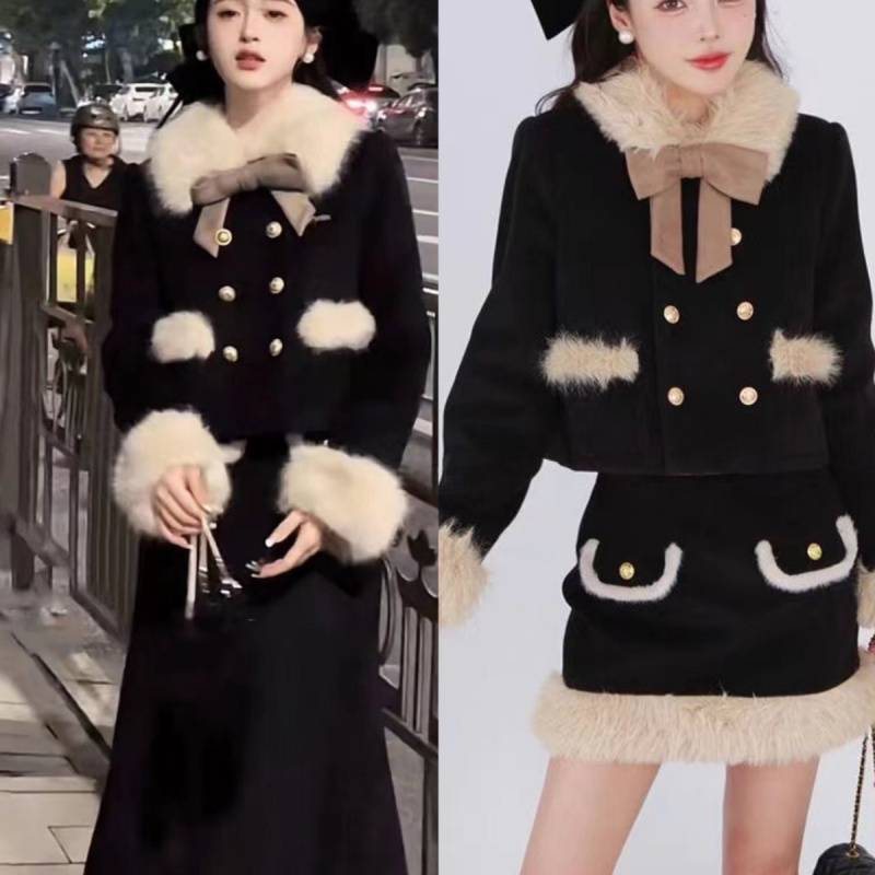 女性のための大きなサイズの小さな香りのジャケット2024春と秋の新しい黒い羊毛のスプレッチされた毛皮の襟厚さ